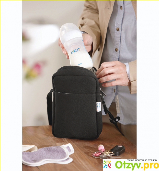 Стильный термос сумка для бутылок "Авент Филипс" вмещает 2 бутылочки для кормления "Филипс Авент", 2 "волшебные чашки". Двойной слой термоизоляции сохраняет молоко холодным, а воду горячей в течение четырех часов. Вы сможете хранить холодное сцеженное грудное молоко или молочные ингредиенты, а также теплую кипяченую воду.