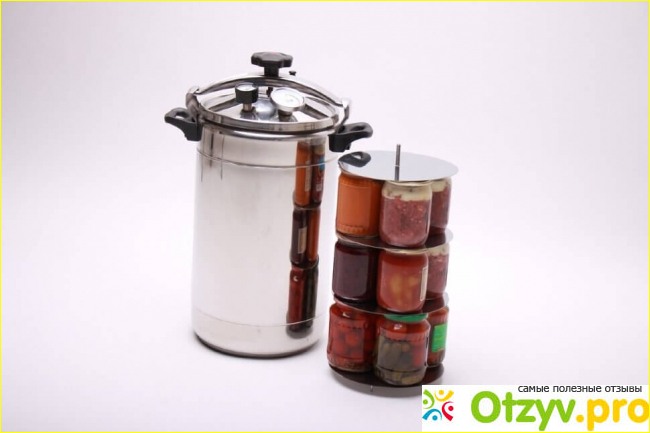 Самым первым в рейтинге будет этот автоклав с регулируемыми давлением кассетами, которые позволяют вставлять банки объемом от 200 мл и до 1 литра. За один процесс можно установить до 15 контейнеров объемом 0,5 литра. Толщина дна прибора составляет 3 мл, его можно использовать на любой варочной поверхности. Внутри бака имеются ребра жесткости, которые предотвращают деформацию устройства при нагревании бака.