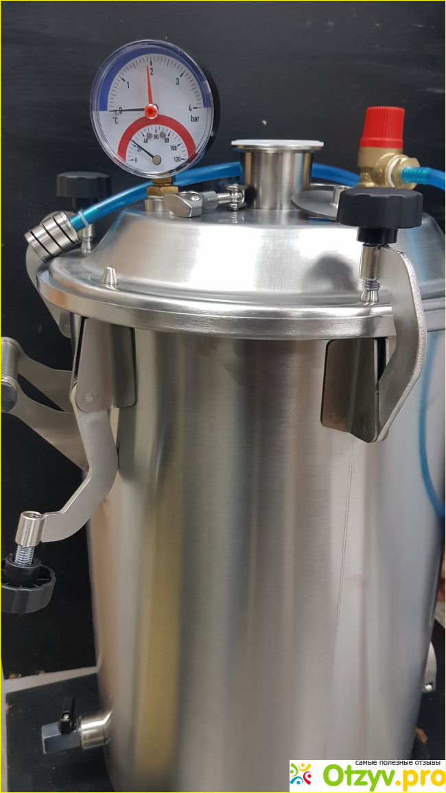 Автоклав сделан хорошо , как и самогонный аппарат . Также предусмотрели удобную систему закрытия крышки на барашках с колпачками, которые не нагреваются в процессе. Тест автоклава я уже произвел , но продукты еще не готовил, потом напишу о результате. Клапан сброса давления срабатывает на 1,5 атм, термоманометр показывает давление и температуру, удобно, что он универсальный.