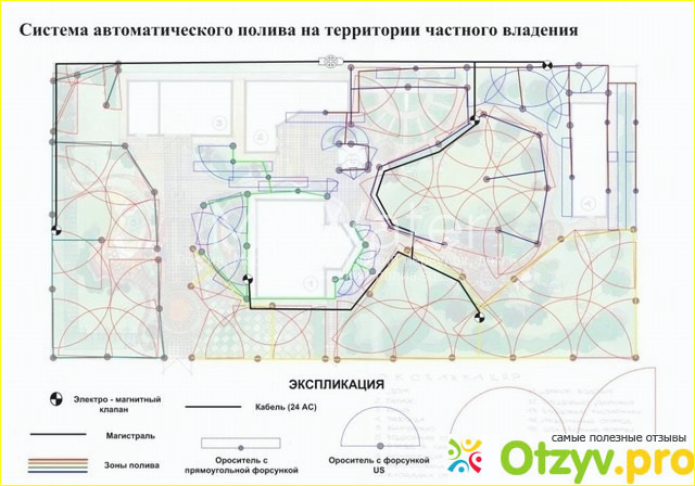 и ее разветвления с указанием дождевателей, количество которых будет зависеть от радиуса их