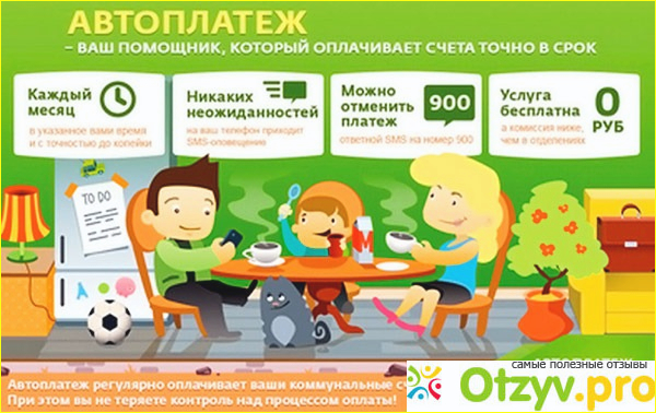 работает как с абонентской платой за телефон. Раз в месяц банк сам связывается со всеми поставщиками коммунальных услуг, узнает сумму счетов и оплачивает их. При этом за сутки вам приходит СМС и предупреждением, нужно проверить, достаточно ли на карте средств. На этом этапе всегда можно отказаться от платежа с помощью той же СМС. После оплаты банк также информирует вас.