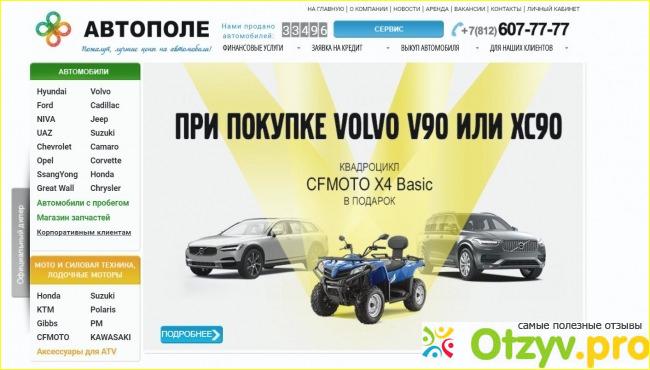 Дилерский комплекс "АВТОПОЛЕ" с 2007 года работает на авто-рынке России и в данное время это крупный официальный дилер в Северо-Западном регионе. В "АВТОПОЛЕ" представлены автомобили марок от известных мировых производителей - "Ford" , "Corvette" , "Jeep" , "Chrysler" , "Volvo" , "Chevrolet" , "Cadillac" , "Honda" , "Niva" , "UAZ" , "Suzuki" , "Great Wall" , "Hyundai" , мото- и силовая техника "Honda" , "Suzuki" , "CFmoto" , "KTM" , "Polaris" , "Kawasaki" , "Русская Механика".