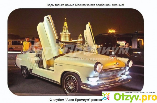 Женился во второй раз, до этого уже прожили вместе пять лет. Думали зачем нам эта свадьба, не молодые уже, пятый десяток разменяли давно. Но тут дети нас уговорили сделать небольшую свадьбу и решились мы шикануть и устроить маленькую, но с шиком регистрацию. Когда выбирал автомобиль который подвёз и увёз бы нас от дворца бракосочетания, наткнулся на эту фирму Авто-премиум, понравился очень их выбор автомобилей. У других фирм с подобными услугами тоже есть не мало машин, но тут выбор получше. И тут я сразу запал у них на Кадиллак Эльдорадо "Крылатый", хотя поначалу хотел выбрать Волгу Газ-21, как у моего отца, но красный красавец победил! Всегда любил Элвиса Пресли, поэтому и выбрал этот кабриолет в духе моего любимого рок-н-ролла! Хорошо, что ещё наша свадьба была в июле) . Невеста моя одобрила мой выбор, и в нужное время красный красавец был у подъезда, нашей молодёжи машина тоже очень понравилась! Долго всем подъездом у ней фотографировались. Машина в отличном состоянии, сразу видно реставрируют они их с любовью! И отделка салона и внешне всё очень чисто и красиво. Водитель молодец, ехал аккуратно и солидно, одним словом шиканули отменно! И ма и наши дети с друзьями остались под большим впечатлением! Одним словом очень всё прошло замечательно и спасибо данной фирме за качественную услугу!