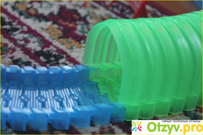 Есть детали для строительства туннеля. Есть подпорки для моста. Каждая деталь достаточно прочно вставляется в следующую, но сама дорога выгибается в разные стороны как хотите, при этом не рушась. Что даёт возможность выгибать дорогу как хотите и в какую только петлю её не скручивать. Все варианты прорисованы на коробке. Также много видео по её использованию можно уже найти и в интернете.