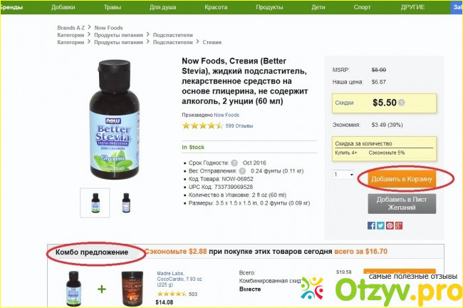 Обычно к товару предлагаются комбо товары - выбрав которые можно получить дополнительную скидку. Очень редко попадаются удачные сочетания) Так же есть подробный состав, калорийность, обязательно читаю отзывы покупателей. Тут же указываются дополнительные скидки, например за количество.