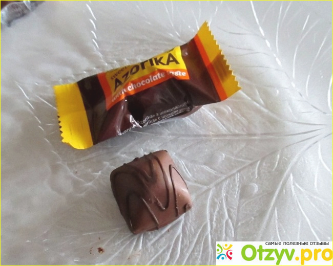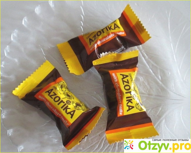 Конфеты «Azorika» с шоколадным вкусом мне посоветовала продавщица, когда я попросила какие-нибудь недорогие шоколадные конфеты с тёмной начинкой.