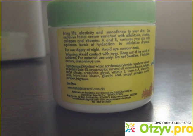 Baba de Caracol представляет собой натуральный продукт, в основе которого слизь улиток. Данный компонент в себе содержит ряд необходимых питательных компонентов, которые необходимы для кожи: кислота гликолевая, витамины А, Е, С, коллаген, аллатоин, эластин и другие компоненты. При регулярном применении крема, можно получить такие результаты: