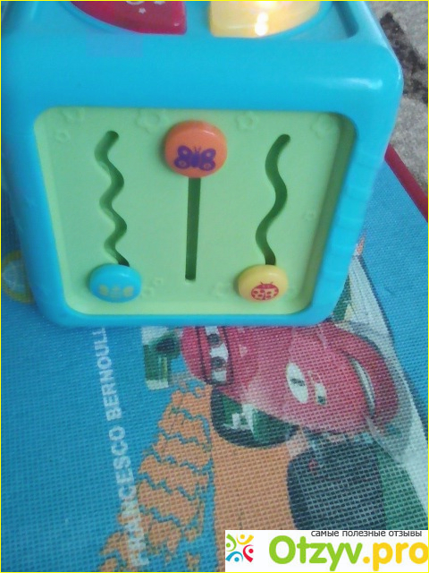 Она перелистывается и можно услышать музыку и голоса котенка, филина, или коровы. Ребенок запоминает не только сами предметы, но и голоса животных. Далее идут два боченка, один из них гремит как погремушка, а второй звук воды и появляются рыбки. Затем третья сторона идет в виде руля. Он трещит и крутится как руль. При этом появляются разные цвета. Затем идут трещетки, в виде насекомых, таких как бабочка, пчела, божь коровка. При чем выполненны они в виде разных дорожек, то есть одна волнистая, другая более волнистая и еще одна просто прямая. Сверху идут кнопки. Включая их, они загораются разными огоньками и играет музыка. При чем музыка разная. То зверушки кричат, а потом поют песни, то просто музыка играет. И в это время загараются огоньки на кнопках.