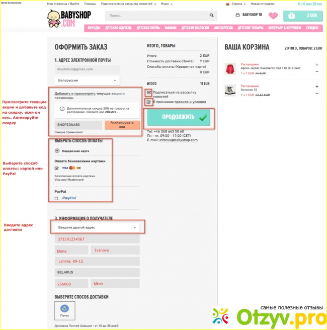Интернет-магазин Babyshop.com - это большая находка для меня. Постоянно заказываю вещи на сайте. Качество обслуживания на высоте. Посылка приходит всегда во время. Все товары есть в наличии, поэтому оплачиваю заказ без проблем и не переживаю, что меня обманут. Зато благодаря этому сайту ребенок выглядит у меня модно и стильно. Это здорово, что у нас в России можно покупать европейские товары по доступным ценам и с таких хорошим сервисом. Жалко только, что вещи идут для детей и до десяти лет.