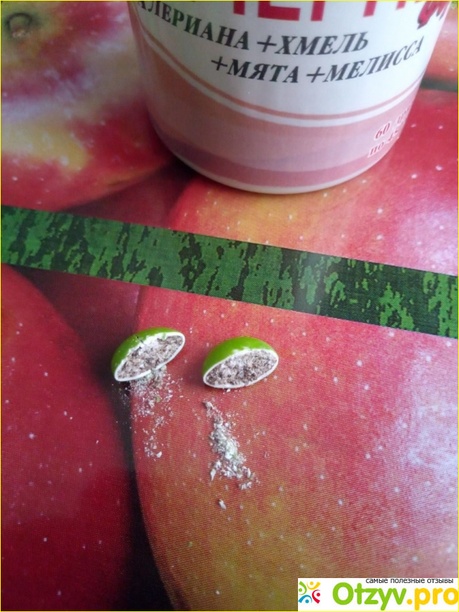 Сам препарат выпускается в форме драже для рассасывания. Я правда не любитель таблетки смаковать, поэтому просто проглотил и забыл. Хотя вкус у этих драже приятный, если рассасывать Терпкий такой, травяной. Вот специально одну препарировал, чтоб внутренности ее показать.
