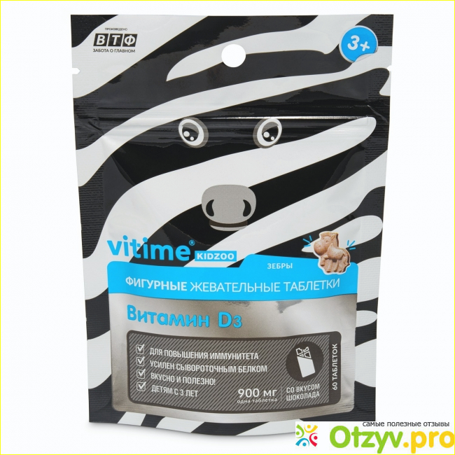 Вкус тоже очень понравился, он шоколадный-кто его не любит !!! Приятно рассасывать или жевать , как угодно. Моей малышке очень нравится . Она даже не поняла, что это, так сказать , лекарство, а не конфетки . Получается , что не нужно уговаривать выпить таблеточку . Или еще хуже, дочь часто отказывается от лекарств в категорической форме . А этих зебрят кушает с удовольствием и просит еще , но больше чем две в день нельзя . Кроме того витамин Д3 способствует росту и развитию маленького человечка и укреплению иммунитета . И это уже нравится мне как матери.