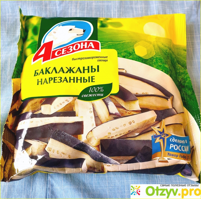 Посмотрев саму продукцию, лично я убедилась, что производитель «4 сезона» действительно придерживается способа быстрой заморозки овощей. Баклажан нарезан дольками средних размеров. Они не мятые, не сморщенные. Поверхность мякоти и кожицы ровная. Ни на овощах, ни на внутренней стороне упаковки нет наледи из снега или льда, чего не скажешь о втором производителе.