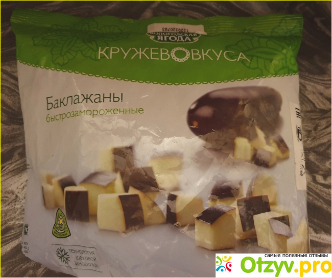 Это баклажаны от неизвестного мне производителя "Кружево Вкуса". Рекламы их продукции я нигде не видела, но решила попробовать. Тем более выбора не было. Дизайн упаковки простой и лаконичный. В глаза не бросается. Ничего необычного. Мне понравилось изображение баклажана на пачке. Кусочки ровные и аккуратные.