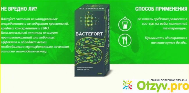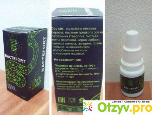 Бктефорт - это специальные капли для приема внутрь, с помощью которых удается быстро устранить паразитов из организма человека. Кроме того что препарат помогает устранить гельминтов, ему посильны вредные бактерии и вирусы, а так же многочисленные грибки в теле человека. Кроме такого воздействия, препарат оказывает профилактическое воздействие по надобности. А так же, средство эффективно устраняет следы пребывания в теле паразитов, уничтожая следы распада и личинки гельминтов. Бактефорт включает в свое действие многочисленные свойства, в список которых входят следующие свойства: антимикробным, слабительным, а так же просто нормализует пищеварение.