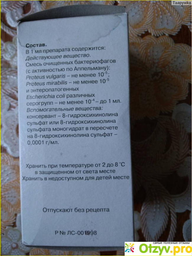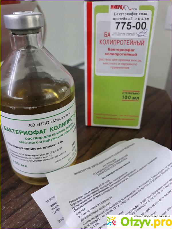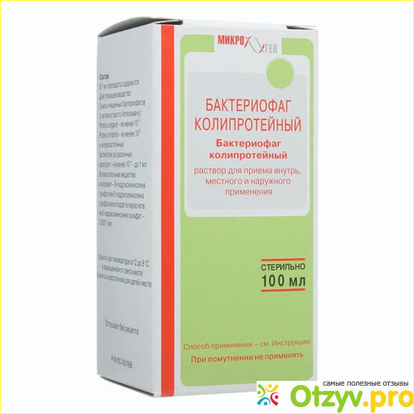 Герой моего обзора тоже относится к этой категории, в его составе содержится бактериофаг коли-протейный, выпускается в форме раствора стерильного по 20 мл или 100 мл, фаголизата микроорганизмов Proteus vulgaris, mirabilis и энтеропатогенных штаммов Escherichia coli разных серогрупп. Относится к антибактериальным специфическим препаратам, то есть тот самый колипротейный бактериофаг – вирус, который призван пожирать все патогенные бактерии в организме человека, однако препарат не оказывает негативного влияния на здоровые клетки человека и не вредит им, он абсолютно безопасен для использования.