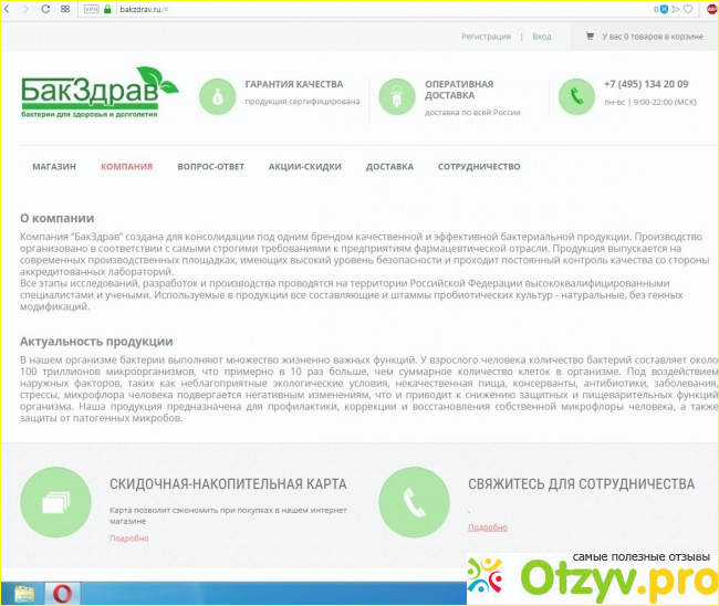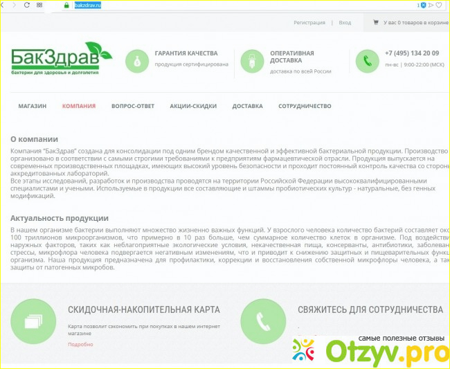 Интерфейс у сайта простой и понятный даже начинающему пользователю всемирной паутины. На главной странице на верхней панели можно найти информацию о режиме работы, контактный телефон, а также ознакомиться с условиями доставки. Производитель разместил информацию о гарантии качества заквасок - они все сертифицированы.