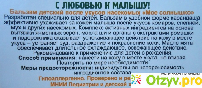 Бальзам имеет очень удобную форму карандаша, как у губной помады. Проводишь им, не надавливая и не втирая, в месте укуса, и там появляется ощущение приятного холодка, которое заглушает зуд, а минуты через 2-3 все ощущения проходят, уже не хочется чесать укушенное место. Покраснение кожи постепенно в течение 10 минут тоже исчезает. Причем достаточно всего одного применения бальзама-карандаша. Такая эффективность этого средства вызвана тем, что в его состав входят активные растительные ингредиенты - вытяжка ячменных зерен, масла ши, мяты и арганы, экстракты ромашки и подорожника. Все ингредиенты безопасны для детей и гипоаллергенны, это проверено МНИИ педиатрии и детской хирургии. А раз детишкам с 0 лет этим бальзамом можно пользоваться, то и взрослым он не навредит.