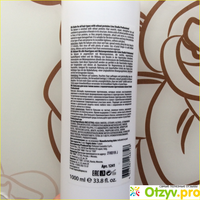 Производитель оставил на ней массу необходимой информации, которая так или иначе пригодится потребителям. Главное это состав, который не отличается ничем натуральным, но стоит помнить, что это косметика из профессионального сегмента. Помимо этого есть информация об применении, правила хранения.
