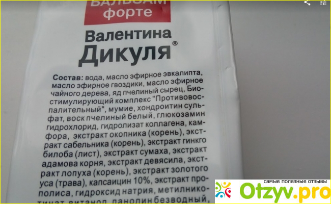 Теперь о составе бальзама, в него входит масло эвкалипта, масло гвоздики, масло чайного дерева, яд пчелиный, мумие, воск пчелиный, окопник, сабельник, гинкго билоба, экстракт лопуха, экстракт золотого уса и много еще различных средств. Конечно состав этого бальзама изумляет и удивляет, тем более, что это авторский рецепт проверенный временем самого академика Валентина Дикуля.