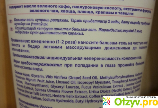 Для профилактики растяжек и для нежного ухода за кожей живота купила данный крем. Прочитала состав и решила, что это вполне бюджетное средство для меня. Итак: 1. Цвет у бальзама полупрозрачный, скорее, по консистенции напоминает крем-гель. 2. Приятный нерезкий запах. Что-то легкое травяное. 3. Легко наносить и бальзам быстро впитывается в кожу. 4. Хорошо увлажняет, освежает, не скатывается на коже. 5. Липкости нет. 6. Растяжек не было, тьфу-тьфу, ни в первый раз, ни потом, надеюсь и сейчас не будет. Использую крем прежде всего как профилактику и для ухода за кожей. Состав, активные ингредиенты: экстракт фукуса, экстракт ламинарии, экстракт таволги, экстракт камелии, экстракт крапивы жгучей, экстракт хвоща, экстракт плюща, экстракт водяники, вит. А, вит. Е, масло арабики, экстракт арабики, гиалуроновая кислота.