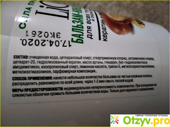 На на лицевой стороне этикетки мы можем прочесть название, то, что бальзам - кондиционер подходит для всех типов волос и даже окрашенных. Этот момент считаю плюсом, так как волосы у меня окрашены. Так же можем прочесть какие компоненты входят в состав - это кератин и масло органы.