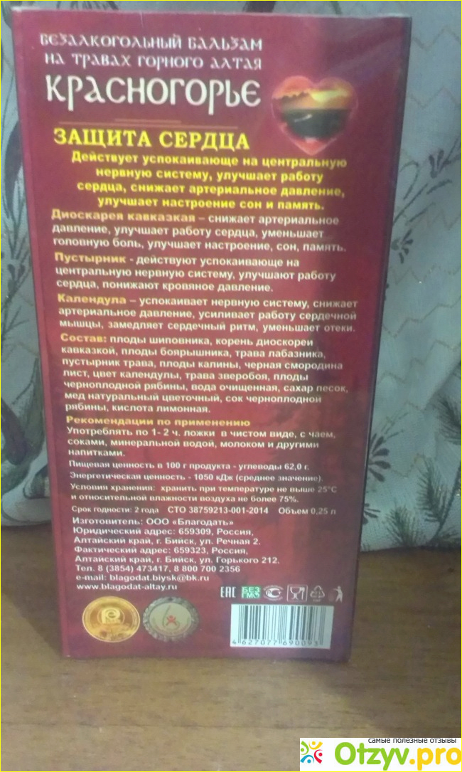 Алтайский край славится своими бальзамами и качество у них на высоком уровне, а так же, что не мало важно используется экологически чистое натуральное сырьё. Окажите поддержку своему сердцу вместе с бальзамом " Красногорье" Защита сердца. Рекомендую вам к приобритению . Будьте здоровы вы и ваши близкие!!! Благодарю за оказанное внимание к моему отзыву. До новых встреч на страницах отзывов.