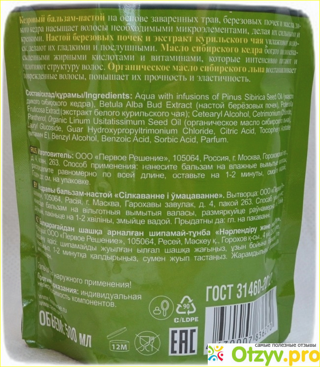 Бальзам упакован в мягкий пакет, который еще в народе называют «майонезным». Имеется «горлышко» с завинчивающейся крышкой, но даже оно не делает пользование бальзамом удобным – пакет так и норовит завалиться на бок или выдавить из себя больше бальзама, чем требуется.
