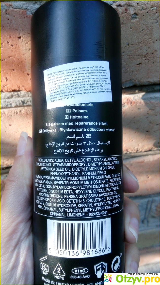 Состав ополаскивателя не идеальный, но как для бальзама средней ценовой категории вполне нормальный. Бальзам содержит кератин, который оказывает благоприятное воздействие на структуру волос по все длине.
