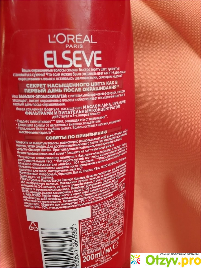 Вот так выглядит мой любимый продукт, ярко-красны дизайн, привычной формы флакон для всех средств этой продукции, если говорить о бальзамах. Вся информация представлена на обратной стороне, вот можно ее прочесть, благодаря наличию русского текста.