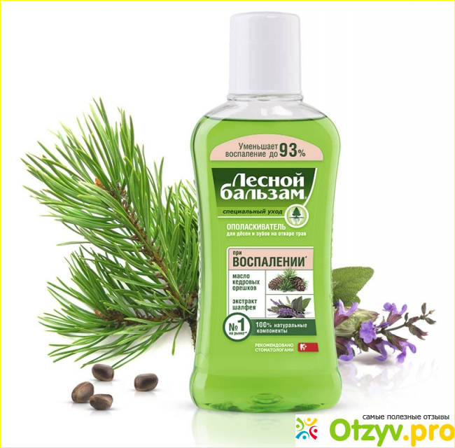 Также Лесной бальзам помогает купировать болевые ощущения, устраняет отечность десен, дезинфицирует полость рта, обладает успокаивающими, ранозаживляющими свойствами.