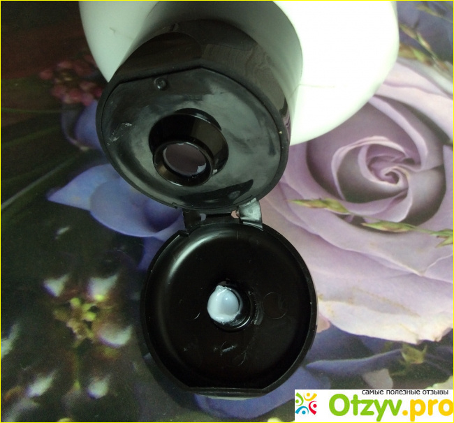 Закрывается упаковка чёрной крышкой, которая тщательно сохраняет средство. Под крышкой есть дозатор, небольшого размера. Но в общем-то удобный для повседневного применения. Хотя, на мой взгляд, помпа была бы для такого размера бутылки удобнее.