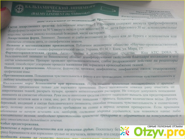 Первым делом, парила ноги в морской соли каждый день, утром и вечером, а на ночь наносила мазь Вишневского, прямо на гнойную рану возле ногтей. На утро, гной вытягивается на поверхность кожи и можно быстро выдавить его и продезинфицировать спиртом рану, чтобы не загноилась повторно. Таким образом, раны на пальцах ног, затянулись за 2 недели постоянного применения линимента Вишневского. Хочу обратить ваше внимание, что мазь очень жирная и если плохо забинтовать пальцы при нанесении мази, то постель вся пропитается жирной мазью. Линимент Вишневского имеет очень резкий и неприятный запах, который долго остаётся на коже и плохо выветривается.