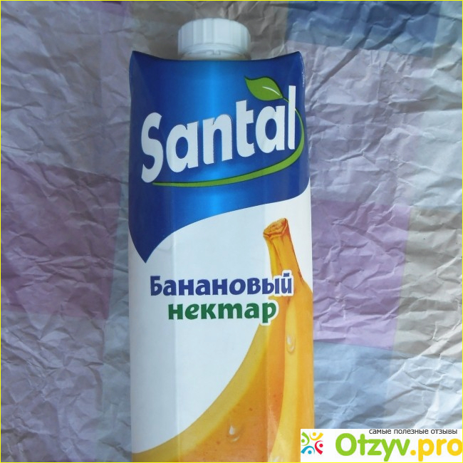 Что я могу сказать о вкусе бананового нектара Santal? Несмотря на то, что доля бананового пюре не превышает 1/4 от общего объема этого напитка, вкус банана достаточно насыщенный и очень приятный, мне именно такой и нравится. Консистенция у данного нектара не густая и не жидкая, средняя, и что удивительно, даже когда в пакете остается немного бананового нектара, он все равно не густой, то есть сильного осадка он не дает. Цвет у этого нектара естественный -- бледно-желтый. Фото несколько искажает цвет.