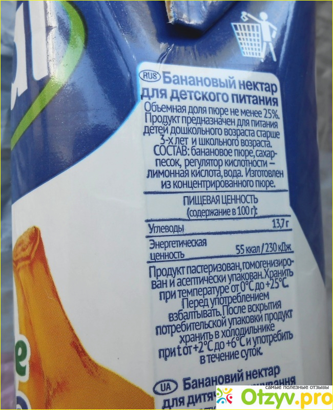 Замечу, что производитель рекомендует пить этот нектар деткам дошкольного возраста с 3-х лет, а также школьникам. Стало быть, состав этого напитка не содержит вредных ингредиентов. Кроме, бананового пюре в нем присутствуют сахар-песок, вода и лимонная кислота, как регулятор кислотности. Действительно, химии практически нет, если не считать лимонную кислоту, но без нее сейчас редко обходятся продукты питания, особенно соки. Лимонная кислота является антиокислителем, кроме того, она выводит из организма шлаки и токсины, улучшает пищеварение, повышает иммунитет, сжигает углеводы. Но чрезмерно употреблять ее нельзя, иначе может возникнуть раздражение слизистой желудка и кожи. Раз данный нектар одобрен для детского питания, значит, в нем содержание лимонной кислоты не превышает допустимые нормы. Несмотря на то, что в этом нектаре присутствует сахар, я не сказала бы, что он очень сладкий. Тем не менее, тем, кто страдает сахарным диабетом, следует учитывать этот факт.