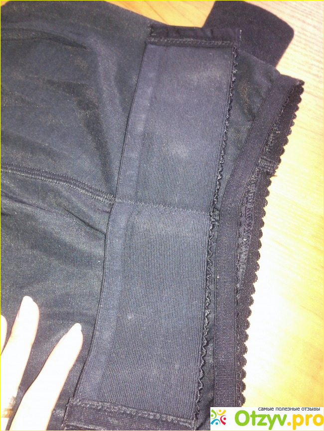 Сверху на поясе бандажа есть очень плотные резиночки, которые сильно сжимают талию. Сфотографировала их крупным планом (на этих резиночках и прикреплены боковые застёжки).