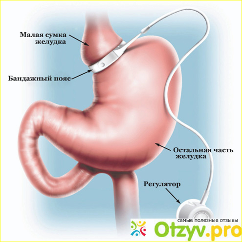 Так как же работает данная методика? А заключается она в том, что две части растянутого от чрезмерного потребления пищи желудка разделяются специальным бандажом. Это не просто бандаж, а целая система, которая включает в себя сжимающееся кольцо и регулятор. Большим плюсом в этой системе является то, что размер кольца можно менять в любое время, естественно, делает это сам специалист, который проводил такую операцию и теперь наблюдает пациента. Кроме того, сама операция не требует полного разреза, а проходит путем лапароскопических проколов, которые практически не оставляют после себя следов на коже. Но стоит отметить, что желудок делится бандажом не пополам, как это может показаться, а на самом деле кольцо накладывается на верхнюю часть желудка таким образом, что после этой процедуры в эту область может поместиться всего-лишь 40 мл еды. То есть, человек сможет насытиться таким малым количеством еды. Такой вариант выбирается еще и потому, что в верхней части желудка расположены рецепторы насыщения.
