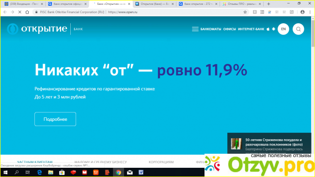 Официальный сайт Банка "Открытие" встречает своих посетителей приглашение рефинансировать свои дорогие кредиты и получить гарантированную фиксированную ставку 11,9 процентов, что лично я считаю весьма заманчивым предложение. Если бы у меня был действующий кредит, скорее всего я бы серьезно задумалась над тем, а не рефинансировать ли его и ответ на этот вопрос по всей видимости был бы положительным.