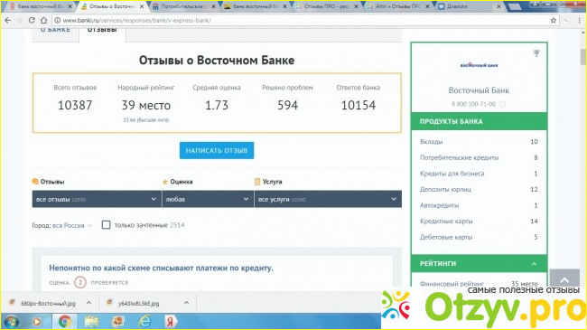 Банк Восточный ОтзывыЕсли зайти на портал банки ру, то отзывы о банке будут далеко не самыми положительными. Связано ли это с неграмотностью населения, или же с сотрудниками, которые не объясняют клиентам все условия кредитования - непонятно. Однако, средняя оценка по отзывам составляет 1,73 из 5, что является очень плохим результатом. Однако необходимо понимать, что не клиенты, что работают с банком давно и не имеют никаких претензий - они не будут писать отзывы, ведь это пустая трата времени. Отзывы пишут на портале те, кто хочет изменить ситуацию или решить конкретный вопрос, привлекая вышестоящее руководство банка. И чаще всего проблема решается. Так например с помощью портала банки ру уже решено 594 спорных вопрос в банке Восточный. В финансовом рейтинге банк Восточный занимает 35-е место, а в народном всего 39-е.