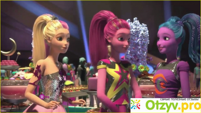 Кумир Барби Салли тоже приглашена. Король Константин персонаж самовлюбленный, он считает себя самым лучшим. Мне понравилось как продуманы планеты, растения, живые существа и наряды. Итак, Барби летит с Парадена в Апалирию. Отец подарил новый Ховер борд и платье для бала. Он трогательно называет дочь маленькой звездочкой. На балу девушка знакомится с остальными членами спасательной миссии. У каждого есть способности помимо владение ховер бордом: принц Лео лётчик и механик, Салли очень быстрая, сестры Шина и Карина специалисты по гравитации и телепаты, Барби умеет двигать предметы и петь. Константин старомодный и скучный мужик. Король приказал пойма друга Барби Астро льва. Король до последнего момента упирался и упрямился и лишь тотальный крах помог ему осознать свою самонадеянность.