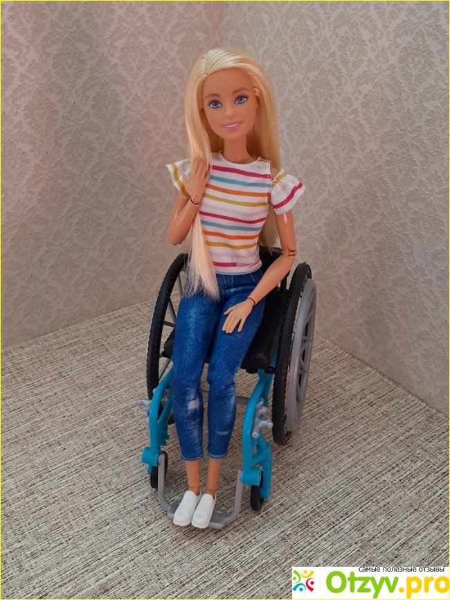 Барби в коляске - типичная блондинка, с роскошными волосами, лучезарной улыбкой. На ней стильные джинсы, летняя блузочка, имеджевые очки, кроссовки. Особого внимания заслуживает коляска, она реалистичная, функциональная, колеса двигаются, и можно полностью имитировать передвижение, если речь идет о детских играх. Это полная имитация человека с ограниченными возможностями. И взаимодействуя с такой игрушкой, ребенок может понять, что перед ней такая же девочка, но у нее есть особенности и она заслуживает доброго отношения и возможной помощи в некоторых моментах.