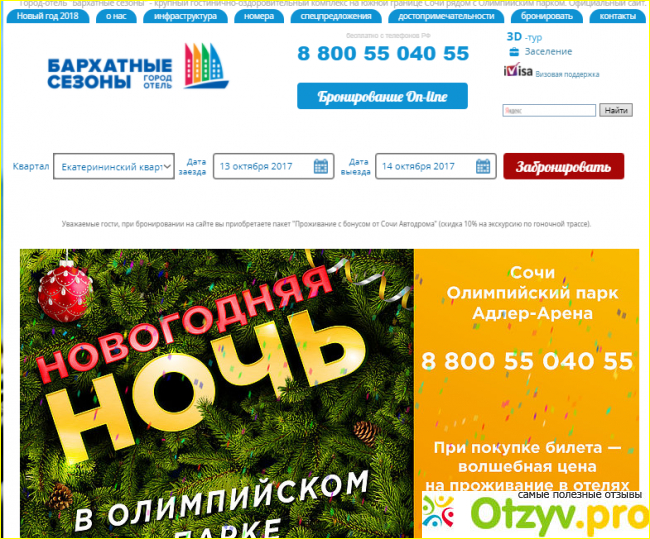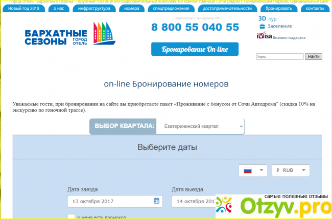 Сейчас хочу рассказать как можно подробнее об официальном сайте, города отеля бархатные сезоны. На нем можно забронировать номер в отеле, на любую дату, и также посмотреть какие номера свободные, можно выбрать любой отель. В бархатных сезонах несколько корпусов и у каждого корпуса есть свое определенное название это- Екатерининский квартал, Чистые пруды, Александровский сад, русский дом и выбрать любой понравившийся номер. Также при бронировании на сайте вы получаете бонусом скидку 10% на экскурсию по гоночной трассе, ещё на сайте можно посмотреть какие есть спец предложения. Тут даже есть спец предложения на 31 декабря 2018 года на новогоднюю ночь в Олимпийском парке можно купить билеты тут же на сайте. Ещё на сайте можно посмотреть все цены на все номера что очень удобно, уже можно сориентироваться, Сколько нужно денег например на проживание на неделю. Также на сайте можно посмотреть какие на территории бархатных сезонов в отелях, есть магазины, рестораны, кафе, какие экскурсии, какой предоставляют трансфер, а также есть тренажерные залы, конференций услуги. Также, какие развлечения есть для детей, какой медицинский центр есть, также есть визовая поддержка, и прокат велосипедов и многие другие виды развлечений и отдыха. Также, какие услуги на пляже, и услуги прачечной тоже есть, также на сайте можно посмотреть какие есть достопримечательности поблизости отеля, есть. Это олимпийский парк, парк аттракционов, автодром и так далее также на сайте можно посмотреть точные адреса отелей, и номера телефонов каждого отеля. То есть можно позвонить в сам отель и что-то узнать поподробнее, если вам нужна информация. Я когда заселялась звонила и узнавала есть ли в отеле на этаже утюг. Очень доброжелательная девушка мне всё рассказала, что у них имеется я осталась очень довольная. обслуживанием. Также на сайте можно посмотреть, как доехать от аэропорта, до отеля бархатные сезоны, даже показано расстояние и время в пути. Также здесь же показано, какие автобусы идут до отеля бархатные сезоны, показано расписание электропоезда Ласточка. Ещё можно посмотреть расположение отеля, на карте как расположен отель, где какие магазины, рестораны расположены, и так далее. В общем удобно на сайте всё это посмотреть, а также очень удобная навигация по всему сайту всё ясно и понятно. Так что если вы собираетесь заселиться в отель, бархатные сезоны, то обязательно посетить официальный сайт отеля, здесь очень много информации об этом отеле вы всё подробно о нем узнаете.