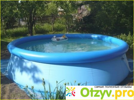 Сам бассейн представляет собой конструкцию из надувного кольца и корыта. Накачиваем кольцо, набираем в бассейн воду и по мере заполнения кольцо с воздухом поднимается с уровнем воды и поднимает стенки бассейна. Материал бассейна достаточно прочный, склейка швов качественная. При установке на не совсем ровную поверхность грунта бассейн склонен к заваливанию в сторону уклона рельефа. Большой объем данного бассейна, являясь неоспоримым преимуществом, вызвал определенные трудности с поддержанием его в чистоте. На практике поменять в нем воду, очистить стенки от образовавшегося налета каких-то микро водорослей достаточно трудоемкий процесс. А чистить нужно, под открытым небом загрязняется вода уже через неделю. Это и насекомые, которые туда попадают, и сор, заносимый на ногах купальщиками. Вода начинает цвести, стенки бассейна покрываются зеленым налетом водоросли. К бассейну существует возможность докупить и подключить циркуляционную систему очистки или добавлять в воду химию для предотвращения цветения, но я на этот счет ничего сказать не могу.