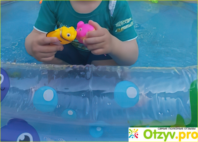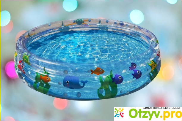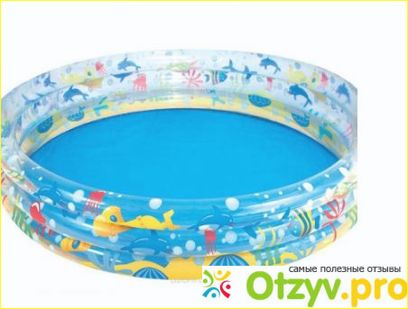 Изготовлен он из прочного и прозрачного винила, что позволяет гораздо быстрее прогреваться налитой в него воде. Бортики у него получаются довольно широкие и мягкие. Дно при этом голубого цвета, плоское в виде плёнки. Во избежание прокола, лучше под бассейном что-нибудь постелить мягкое. Ребенку очень нравятся рисунки на бассейне. Объем позволяет побултыхаться 2-3 малышам одновременно. Там можно полежать даже взрослому, только естественно с головой на мягком бортике. Бассейн легко надувать любым, даже ручным насосом. Чтобы надуть бортики, есть 3 клапана по отдельности, то есть для каждого надувного кругового бортика свой клапан. Клапана для слива нет, так что приходится вычерпывать, а потом остатки воды сливать вручную. Когда наливаешь в него воду, благодаря синей расцветке получается очень красивый голубоватый цвет. Выглядит очень приятно.