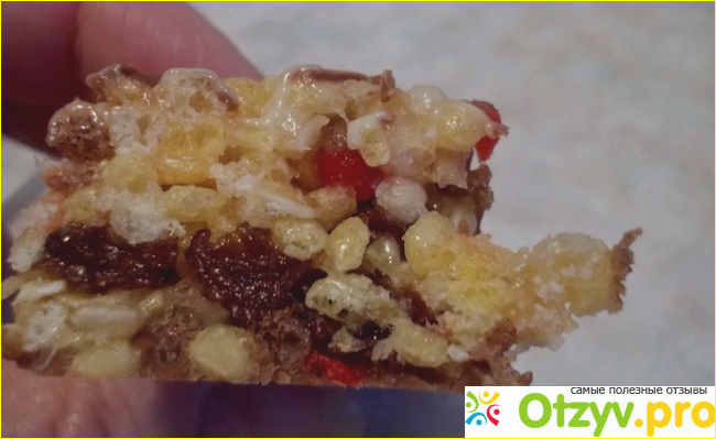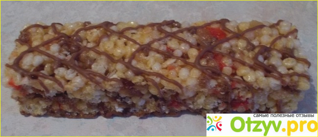 Снизу у батончика - молочный шоколад. Это как связывающая подложка. Сверху в сеточку нанесено тоже немного шоколадки. Это все, что есть сладкого в батончике. А остальное - рис, злаки, хлопья, подсушенные ягоды.
