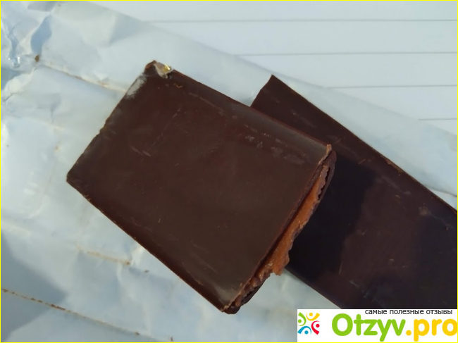 Начинка вкусная, с хорошо выраженным шоколадным вкусом и с явным привкусом рома. Начинка средней густоты. Если отломать кусочек от батончика и положить его на стол, то начинка вытечет из него, но не вся и не быстро.