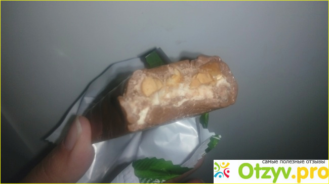 Сверху батончик покрыт толстым слоем молочного шоколада.