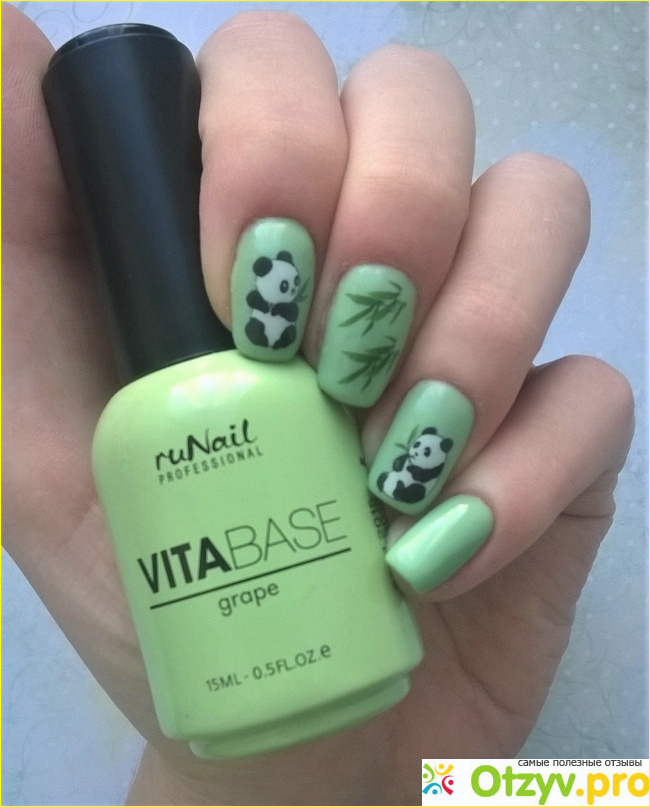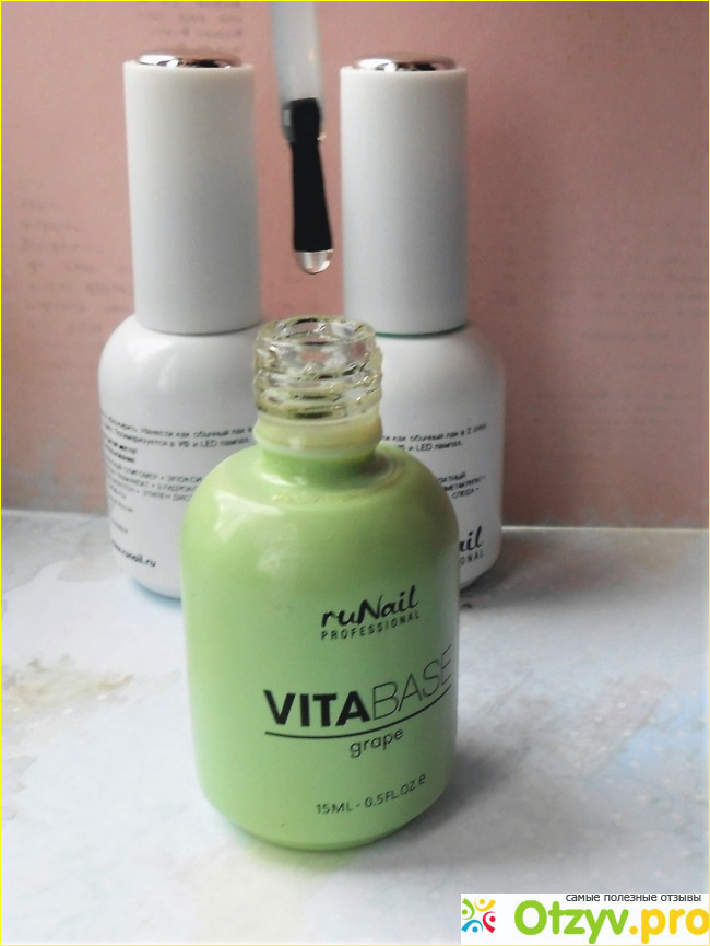 Технология декоративного покрытия гель-лаком такова, что сначала необходимо нанести на ногтевую пластину базу. Компания RuNail professional, между прочим, наша, российская, разработала основу для цветных гель-лаков с маслом виноградных косточек, которая питает и укрепляет ноготочки, насыщая их витаминчиками. Узнав об этом, я сразу же заказала себе симпатичный флакончик зеленого цвета объемом 15 мл по цене 380 рублей.