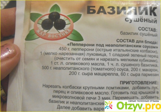 Состав идеальный, только сушеный базилик и все, больше ничего нет. Для покупателей на упаковке имеется рецепт, можно попробовать приготовить что-то новое с использованием базилика сушеного.