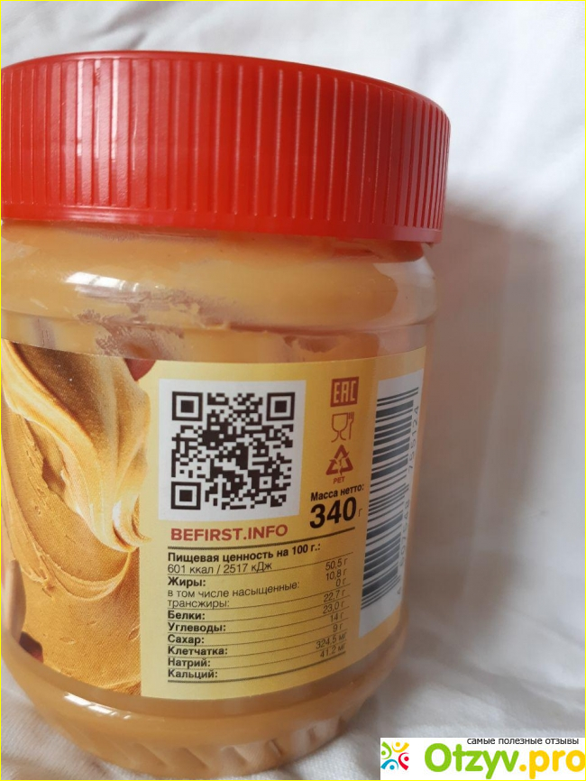Продается в банке, общий вес 340г, стоит 230 рублей. Саму пасту предохраняет защитная мембрана, крышка плотненькая. Хранить рекомендуется в холодильнике, но лично я предпочитаю, когда консистенция более мягкая, поэтому просто храню в шкафу.