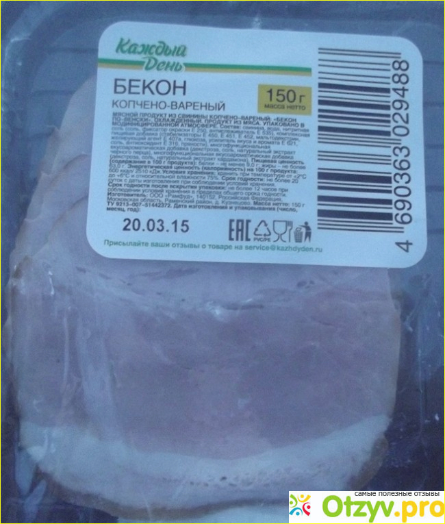 Сейчас хочу поделиться своим впечатлением о копчено - вареном беконе, выпущенном под брендом "Каждый день". Прельстила меня в данном продукте прежде всего цена: за 44 рубля ни в одном другом магазине я таких нарезок не видела.